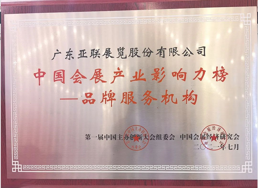 廣東亞聯(lián)展覽股份有限公司被授予“中國(guó)會(huì)展產(chǎn)業(yè)影響力榜--品牌服務(wù)機(jī)構(gòu)”牌匾
